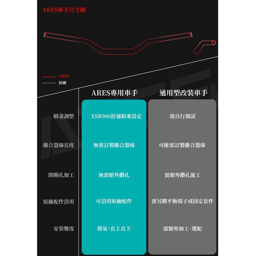 ARES 為 YAMAHA XSR900 (2016-2018) 專屬設計的舒適設定升級型車手,針對亞洲騎士體型重新調整參數,改善原廠設定帶來的操駕疲勞感。此設計讓手把角度更自然,長途騎乘不易造成手腕與肩頸壓力。車手把採用鋁鎂合金材質,兼具輕量與高剛性,並搭配 SP 陽極黑工藝,外觀質感全面提升。安裝過程免修改直上,保留原廠零件即可完成,讓舒適性與外觀一次升級。